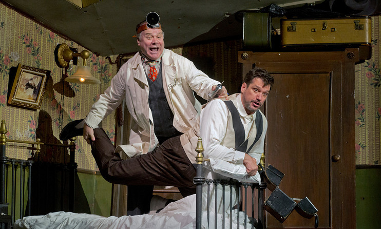 In the pit was Valery Gergiev whose considerable skills with Russian music make him a welcome and returned presence to the Metropolitan Opera this year. Mr. Gergiev is often variable as a conductor, but this performance was brisk and energetic. The complex structures and musical in-jokes in the score were played with energy and rough good humor, with the complex percussion parts bursting out of the pit to accompany the antic chase onstage. Also welcome: the return of Broadway baritone Paulo Szot as the aggrieved Kovalyov, owner of the Nose. Mr. Szot's clowning and comic timing draws the viewer inside his postage-stamp sized Moscow apartment and his character's vain, miserable existence. He gets laughs by playing the part relatively straight especially in the third act as the character struggles to reattach the Nose to his face. Mr. Szot was surrounded by a fine cadre of singers in key supporting roles. These are led by Russian stage veteran Vladimir Ognovenko, as Yakovlevich, a drunken barber who may have been the means of the Nose’s removal. Tenor Andrey Popov drew laughs as the Police Inspector, a figure reminiscent of the Captain in Berg’s Wozzeck. Theodora Hanslowe shine as the Matron, an aristocratic figure beset with one of Mr. Kentridge's more inventive masks. The ensemble featured a number of artists familiar from appearances at the recently deceased New York City Opera. These included baritone Kevin Burdette and bass Kevin Glavin, two fine artists whose excellent comic instincts shone in the large ensembles. Also worth mentioning: soprano Ying Fang as Kovalyov’s confused love interest and Gennady Bezzubenkov as the madcap Doctor (another Wozzeck figure) who may do more harm than good in his efforts to reattach the Nose. Like most of the figures in this show, the Doctor is a fool. However, when he asks the aggrieved Kovalyov if he is missing any other body parts, he hits this opera's psychological subtext on the...nose.