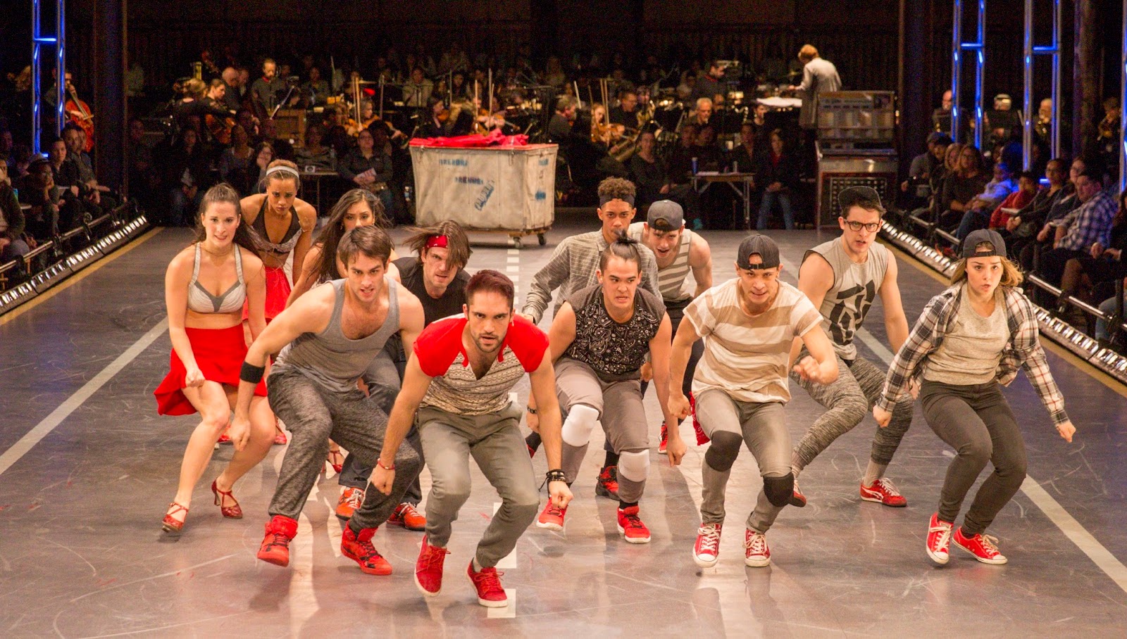 The score was played with exuberance by a 40-piece ensemble (larger than a normal Broadway band for this show) under the direction of Marin Alsop, the acclaimed American conductor. Ms. Alsop caught the raw rage and vitality in Bernstein's use of stark intervals and slashing, dissonant chords. This gives way to the doomed Tristan-esque love music of Tony and Maria, and the Latin jazz beats that accompany the Puerto Rican gang, the Sharks. And yes, the orchestra and singers were amplified, an unfortunate necessity in the awkward industrial acoustic provided by the building. The chorus, which appeared both on the runway stage and on bleachers at one end behind the orchestra, was not.