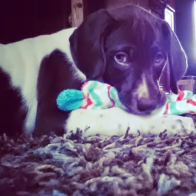 In the end, the list of pros won and in April we were reserved a Female German Shorthair Pointer born on Easter in Braham, MN. Aaron, Avrie and I were able to visit the litter before it was time to take our pup home. That was such a fun day for us AND Avrie. Being able to see the puppy so brand new was TOO CUTE! AND to being able to see/meet both the momma "drew" and daddy dog "ted".