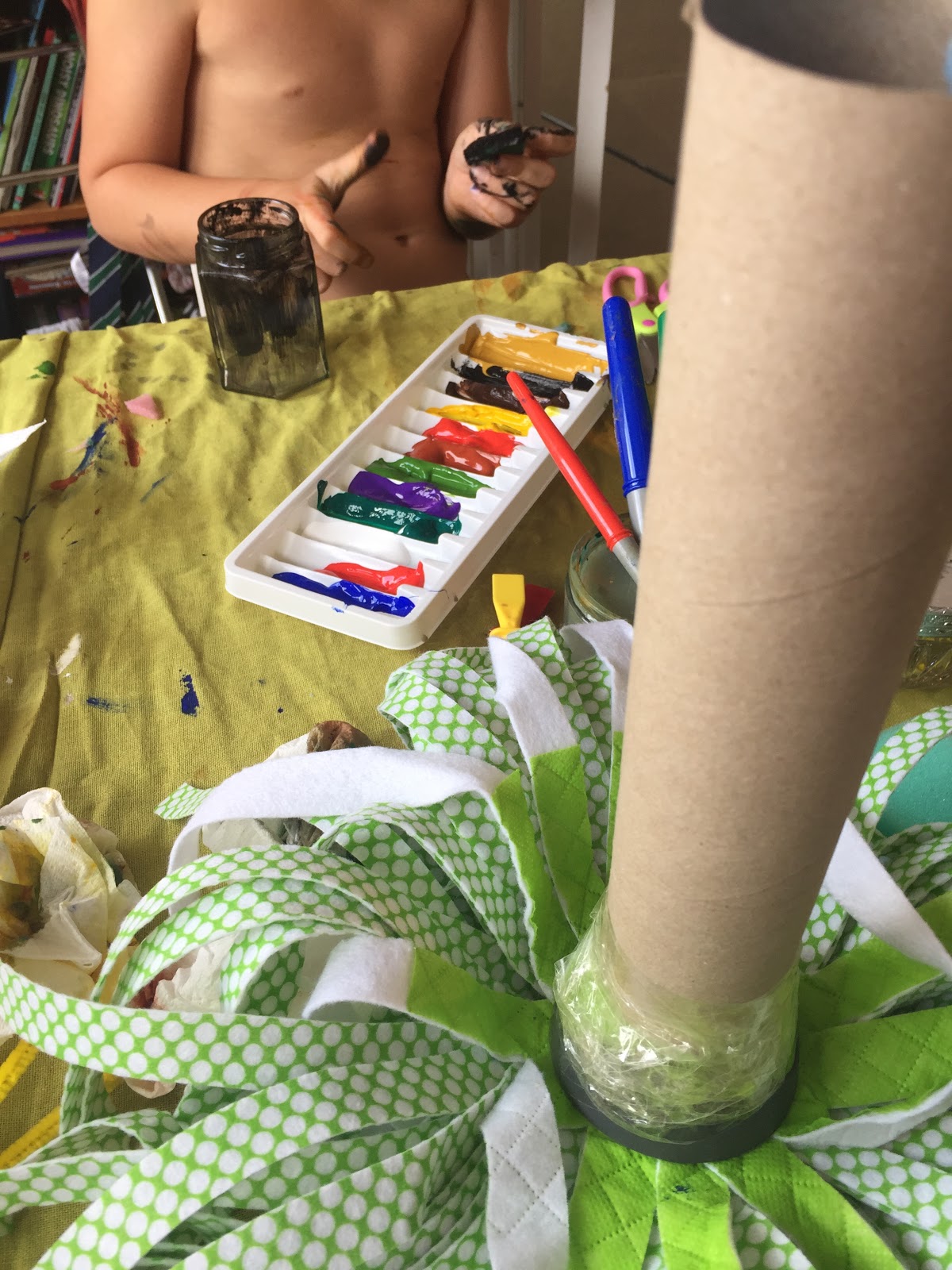 The rocket - dipped in watered down red paint (we didn't have a lot of paint to work with, so we mixed it with water and dipped the mop end it - Jacob wanted it red to look like flames.