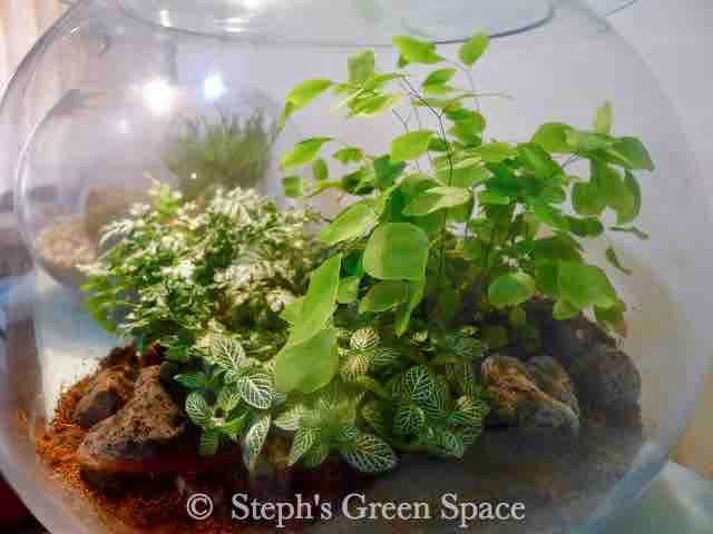 Here is a close-up look. I purposely make it look like a fernery ;-) Cool? I have a Maidenhair Fern, Victoria Fern and some Snake Skin Plants inside...