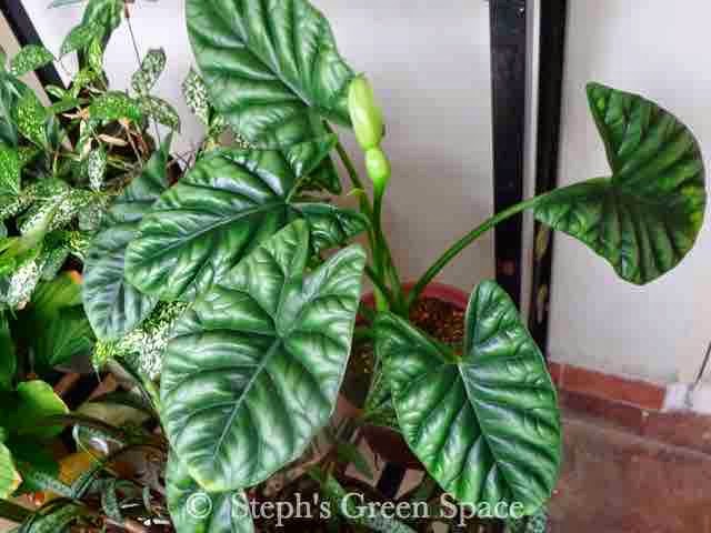 Below is a close-up look of the inflorescence of the Alocasia sp. after the 'hood' has dropped downwards, showing the spadix. Btw, if anyone has a solution for yellowing tips, please share. This plant has been giving me this problem ever since I bought it.