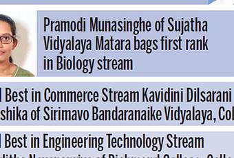 With the GCE Advanced Level Examination 2022 (2023) results issued yesterday the island first rank in the Biology stream was obtained by Pramodi Munasinghe of Sujatha Vidyalaya Matara, while Maneth Banula Perera of Royal College Colombo obtained the island first rand in the Physical Science Stream.