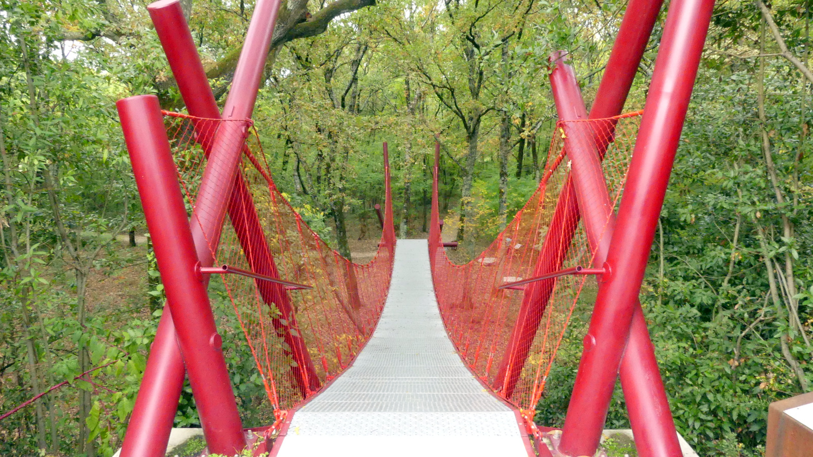 Parc Ausone, to be found in the suburb of Bruges, is a recent addition to the local landscape and provides an unusual combination of woodland paths, play areas, and public artwork… not to mention a tall viewing tower, some snazzy metallic walkways and, best of all, a suspension footbridge. The park certainly deserved an exploratory visit.