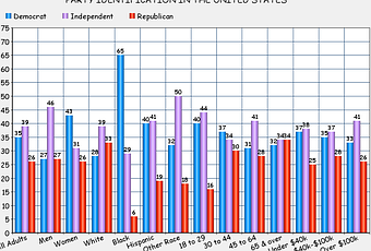 These charts were made from a recent YouGov Poll conducted between July 26th and 28th of a random national sample of 1,000 adults, with a margin of error of about 4 points. I don't have much to say about it, except that when it comes to political identification most people today prefer to call themselves Independents. They are angry with both political parties. But more Americans continue to identify as Democrats than Republicans. And the teabagger support remains very low.