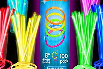 -- Get ready to light up your next party with 100 easy-to-activate and vibrant multi-colored light sticks and 100 reliable connectors that stay in place for hours. You can use these glow-in-the-dark party favors as decorations or during pool or bathtime.