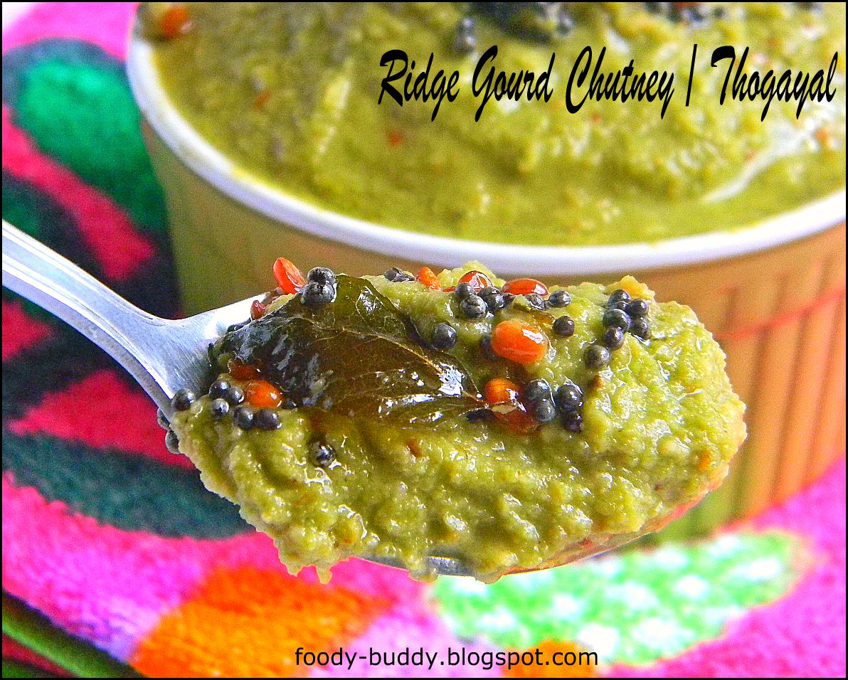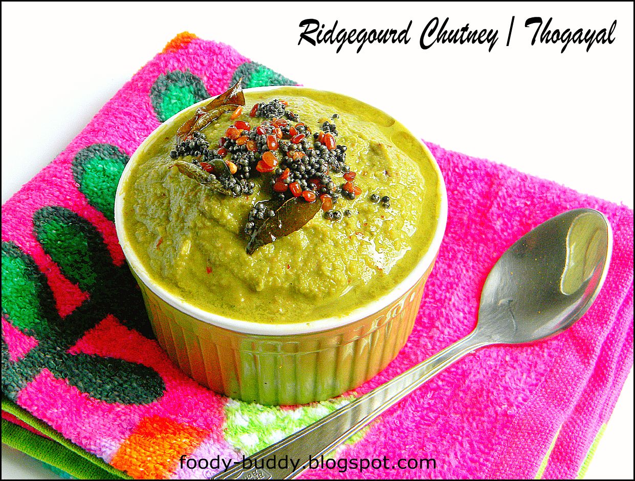 Ridge gourd also known as Peerkangai or Chinese okra. It belongs to cucumber family, high in vitamins, minerals and fiber. Whenever I find ridge gourd in my nearby store, will surely buy it and make sambar and with leftover skin , I will make thogayal / chutney. It's really nice idea of using skin without wasting it. It has lots of fiber and nutrition in it. This is very easy to make thogayal and tastes yumm...Best accompaniment for this thogayal are idly or dosa or rasam rice or plain white rice.