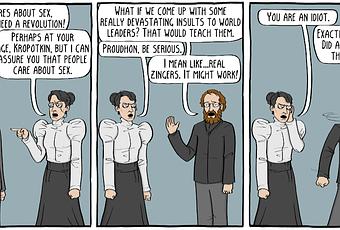 In fact, like the hover text says, everyone in this comic was arrested for what they are arguing for. Bakunin was arrested for trying to bring about democracy, Kropotkin for 'subversive political activity' (whatever that means, most likely just being an anarchist), Emma Goldman for 'illegally distributing information about birth control', and poor Proudhon was arrested for insulting Napoleon III, a rather silly thing to be arrested for and unfortunately for him that meant he had to look rather silly in the comic.