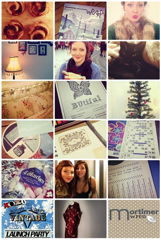 I'm squeezing in a quick blog post between exams. I've already had one this morning, so am sitting down with a well earned cup of tea. I have got lots of deadlines at the moment so all has been fairly quiet on the Thread and Butter front. Here is a haul of photographs so you can see what I have been up to lately.(From top left to right)1. Home made roly-poly mince pies.2. This months magazine from my Stack subscription is Wrap. It celebrates illustration, design and creative culture. It's full of beautiful prints and interviews that are great to read huddled up away from the winter chills. There's also a selection of prints that you can pull out and use as wrapping paper/posters. Definitely up there on my list of favorite magazines.3. Wrapping up in my furry winter scarf4. A beautiful lamp I bought from The Crooked Book. So happy to have found this independent coffee/book shop as it's just round the corner from my house. It's got a great range of vintage home ware on sale too. 5. Bratwurst! It's not Christmas until you have been to the Christmas Market and eaten a yummy German sausage.6. One of two cute kitties that live back in Southampton at my mums house. I miss them lots and wish they could be with me in Bournemouth. I am a self confessed crazy cat lady, I even blow them kisses on facetime :/ too far?7. Star Christmas lights bought from Wilkinson for £12. After spending lots of money on the lounge I'm on a mission to make the bedroom more homely. Can't go wrong with glowing fairy lights.8. BUtiful Animation Festival was held by Bournemouth University on a few weeks ago. It was great to see lots of different types of animation. After watching an animator work all day and night to complete projects, I really appreciate all the work that goes into producing films.9. My mini Christmas tree!10. These are a few business cards of my favorite stalls from a pop up market I stumbled on during a beach bike ride. 11. Illustrations I was working on before all my deadlines fell on top of me. Hope to get back into drawing and get some prints made up in the New Year. Watch this space for resolutions.12. B-I-N-G-O! What started to be a joke is now turning into a Thursday tradition. We've started going to Bingo. It seemed to be a case of beginners luck, with the first time we went take home was over £80. I can't say the same for the following trips, but you never know. 13. Lebkuchen authentic German bisuits with a crispy sugar glaze. They are the tastiest treats. It's a shame they are seasonal, however a blessing in disguise for my waistline. 14. My buddy Nora. I've been missing Southampton a lot lately. You don't know what you've got until it's gone as they say. However, I am super excited about going home for Christmas.15. New promo posters16. This month was the launch of South Coast Vintage. It's a new one stop shop for a vintage clothes, they are also stocking a great range of independent labels from around the UK. Including Thread and Butter ;) The launch party was hosted at Unit Club in Southampton and looked like a brilliant night. 17. Splatter tshirt by Thread and Butter. This range is available to buy through South Coast Vintage so do make sure you check them out. All handmade to order so 100% unique.18. Mortimer Wren is the brother company of the lovely Matilda Wren. A great collection of vintage menswear available. You'll find them at markets all around the South so check their website for their whereabouts.