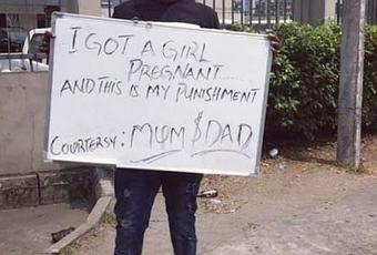 The inscription on the placard reads: ”I got a girl pregnant and this is my punishment. Courtesy; Mum and Dad”