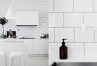 A white tiled kitchen simply accented with white furniture.
