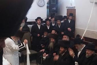 this is a picture of the "mitzva tanse" of the rebbe of Kretchnif Siget with a kalla - the kalla of his son. This is form the last night of sheva brachos - in Kretchnif SIget their custom is that the rebbe does his mitzva tanse at both the wedding and at the last night of sheva brachos. Due to a shortage of space available in the beis medrash, the mitzva tanse was performed long distance via an extra long gartel or rope, with the kalla in the ezras nashim.