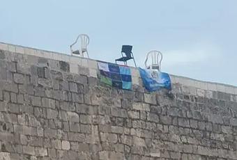 right-wing activist Yair Ansbacher went up on Har Habayit today and form that side unfurled a couple of signs to hang form the top of the Kotel. They are hard to make out form the picture but one is a sign with the names of the 12 tribes of Israel and the other is a sign that says מי לה' אלי - who is for Hashem, join with me! Ansbacher was detained.