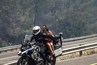 An Israeli officer rescues a father and child from the Jerusalem forest fires, shielding them with one hand.