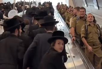 Soldiers head back to the bases from Jerusalem via the train station while Haredim from around the country head into Jerusalem via the same train station for today's rally/protest