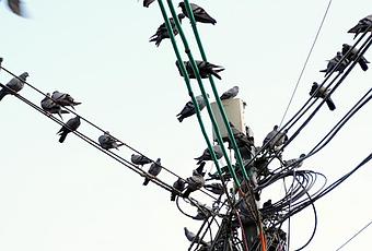 Pigeons are no doubt attractive ! - they come in dozen and at some other places in hundreds .. .. in thousands !! line of tiny birds on power lines looking down at you?