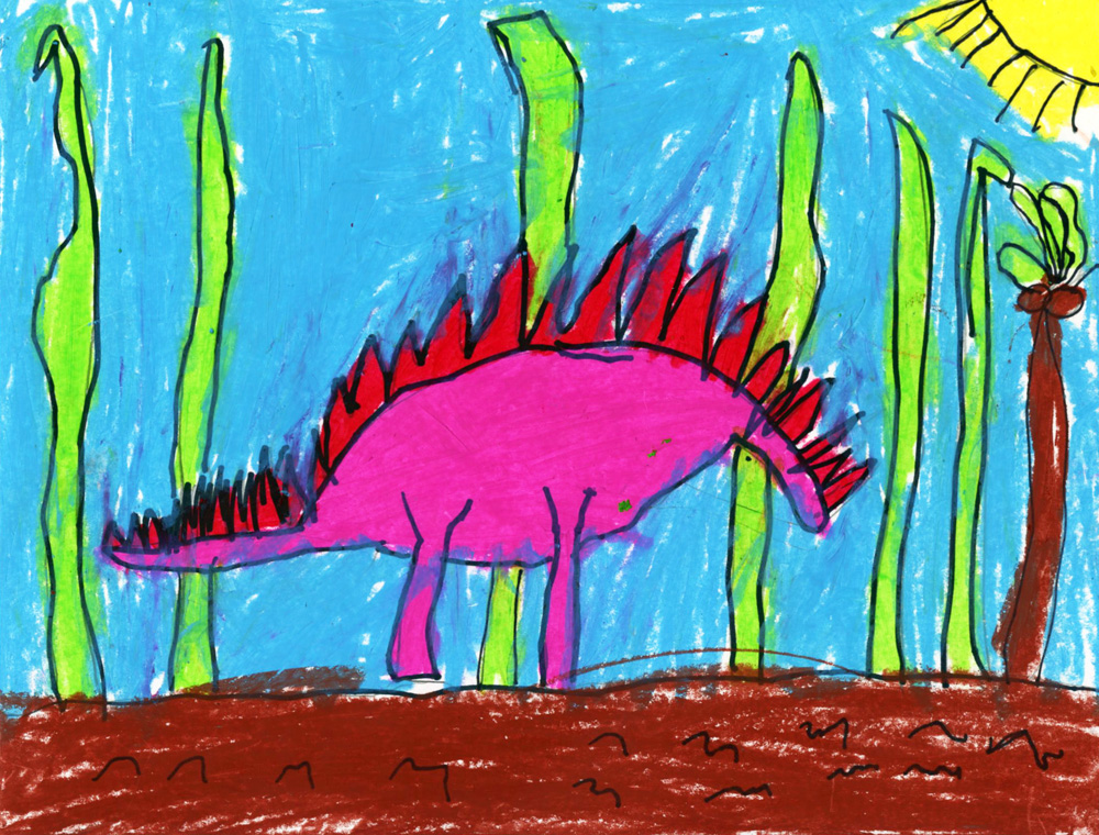 I chose dinosaurs as my after school oil pastel project today, wondering if I would get any objections from my female students. Well, not only did they make some of the prettiest and pinkest stegosauruses you ever saw, one girl proceeded to rattle off more dino facts than I have ever heard before.1. Students followed my drawing, starting with the back, then belly and legs. The triangle plates were added last, starting with small ones at the end and large in the middle.2. All the pencil lines were traced with a black Sharpie marker.3. All the shapes were colored in with Portfolio® Oil Pastels.Thanks so much to Kaylee, a talented first grader who made this amazing drawing today!