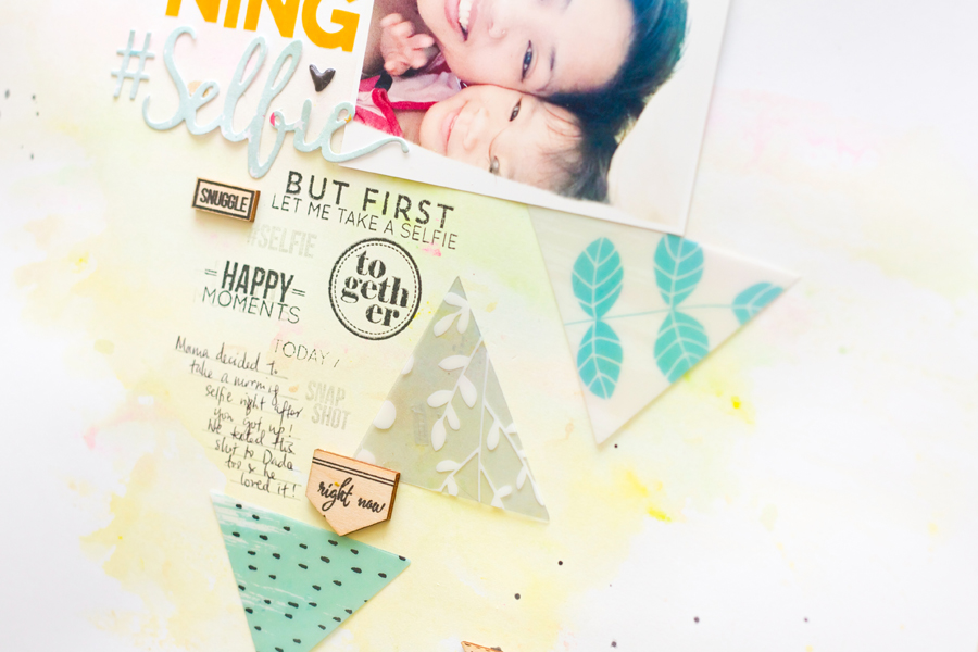 This second layout was really fun. I went all out with the stamps (designed by Kellie Stamps). Those stamp wordings perfectly matched the photo of my daughter and I. Completed the look by adding triangle acetate die-cuts.