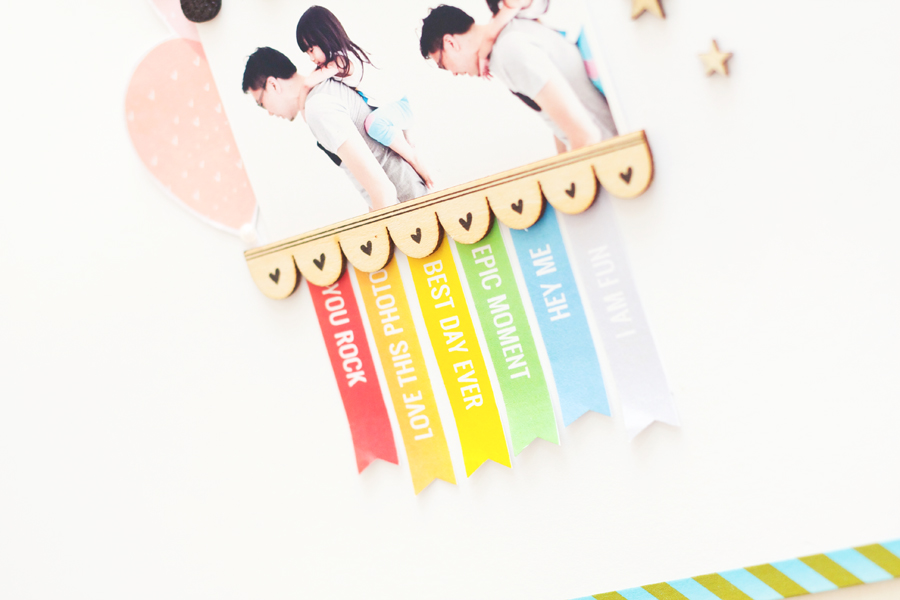 And as always I love creating with the kit, it really challenges me to think out of the box. For this layout, I wanted to have this "air balloon" feel to my layout. I cut the balloons out from one of the Happy Things patterned paper. It was pretty easy to put all the elements together.