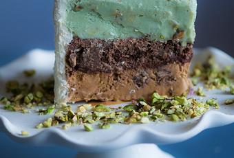 As before, remove the second ice cream flavor from its packaging. Cut it into slices and fit these into an even layer on top of the crumb layer. Freeze the cake in its pan, covered with plastic wrap, at least overnight (or up to a few days).