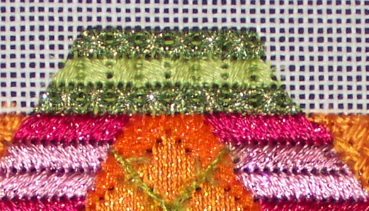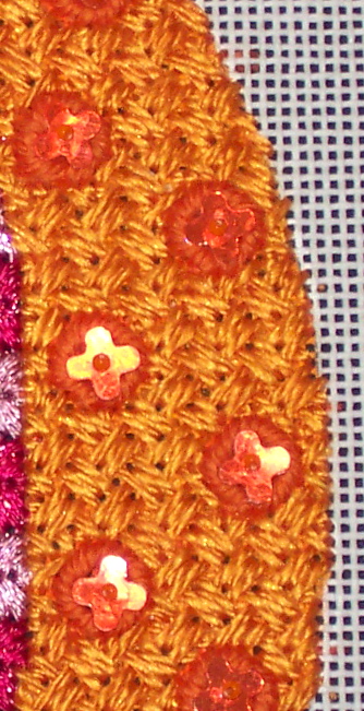 The stripe bands are a fun and very quick stitch:The outer bands feature more fun flower sequins-- these are holographic orange and oh-so pretty!I used the same threads for the stems on all three pumpkins, but stitched them all differently:Only two more corns and one pumpkin left to go! The club officially starts to ship April 1, so there is still time to get your name on the sign-up list at your favorite LNS. And once you get started stitching, if you have any questions at all, be sure to contact me here at the blog and I'll be happy to help!
