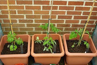 This is not the final configuration of the pots. When the tomato plants get a bit bigger, the pots will need to be spread further apart, in a single row, otherwise they will not get enough light or air.