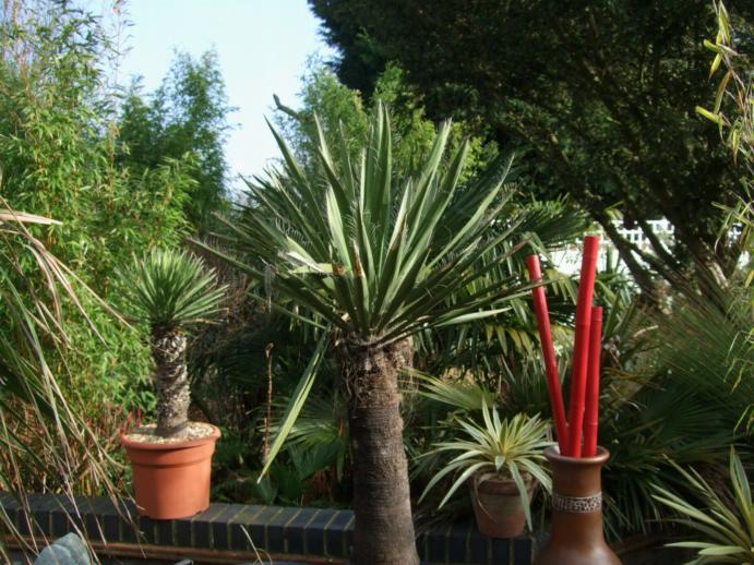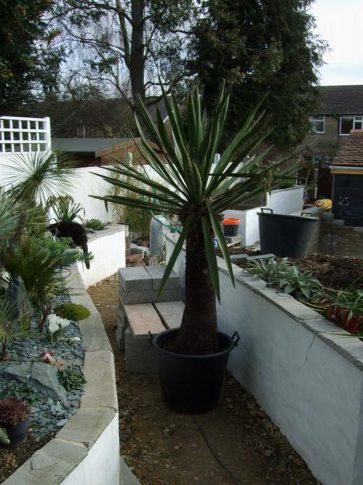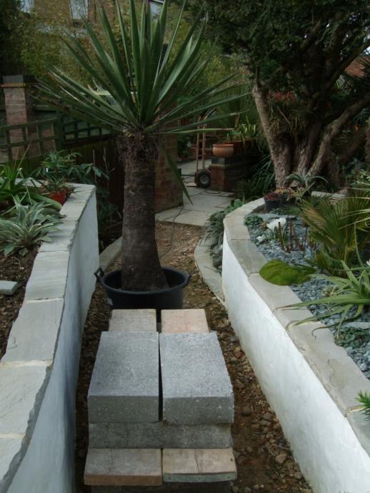 To get round this we built temporary steps from concrete blocks and scaffold board, this at least made it a three part lift rather than having to heave it up in one go.The next problem was how to get it out of the pot. We decided that we would have to cut the pot apart to get the plant out, a shame as these big pots are useful but it was just too heavy to lift the Yucca out of the pot.