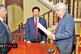 Prime Minister Ranil Wickremesinghe taking oaths as Acting President before Chief Justice Jayantha Jayasuriya, PC at the Walukaramaya temple in Colombo yesterday.Secretary to the President Gamini Senarath was also present.