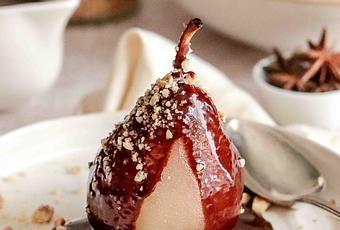 " data-orig-size="3737,5431" data-image-title="Spiced poached pears with chocolate sauce" data-image-caption="" aperture="aperture" />I poached the pears in a spiced sugar syrup, and the combination of warming spices, velvety dark chocolate and toasted crumb create a sensational contrast of flavours and textures. The cool part? Most of it can be made ahead. The crumb can be prepared in advance and stored in an airtight container, and the sauce – though it comes together in just two minutes in the microwave – can also be made ahead and gently reheated when you’re ready to serve.