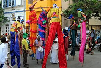 Moving away as a form of entertainment, people walk on Stilts or stand on wooden legs with forms of Horses, Tigers and the like and dance around. Stilts are poles, posts or pillars that allow a person or structure to stand at a height above the ground.