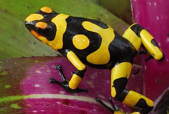 The skin glands of this amphibian produce a highly toxic poison capable of repelling or even killing small predators.These frogs are considered one of Earth's most toxic, or poisonous, species. For example, the golden poison dart frog has enough poison to kill 20,000 mice. With a range of bright colors-yellows, oranges, reds, greens, blues-they aren't just big show-offs either. Those colorful designs tell potential predators, "I'm toxic. Don't eat me." Scientists think that poison dart frogs get their toxicity from some of the insects they eat. How do poison dart frogs capture their prey? Slurp! With a long, sticky tongue that darts out and zaps the unsuspecting bug! The frogs eat many kinds of small insects, including fruit flies, ants, termites, young crickets, and tiny beetles, which are the ones scientists think may be responsible for the frogs' toxicity. Poison dart frogs live in the rain forests of Central and South America.