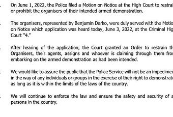 The injunction was granted by the High Court following an application on notice by the Police Service.