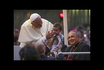 The three dozen visible Vatican and Brazilian plainclothes security officials struggled to keep the crowds at bay. Francis not only looked calm but got even closer to the people. He rolled down his back-seat window, waved to the crowd and touched those who reached inside. He kissed a baby a woman handed to him.