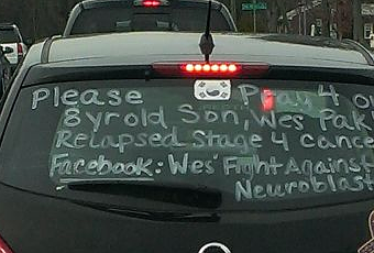 She was in a black Nissan Versa with a message scrawled on her back windshield. At first, I wasn't close enough to read it but was intrigued because the message was longer than those usually scrawled on the back of a car.