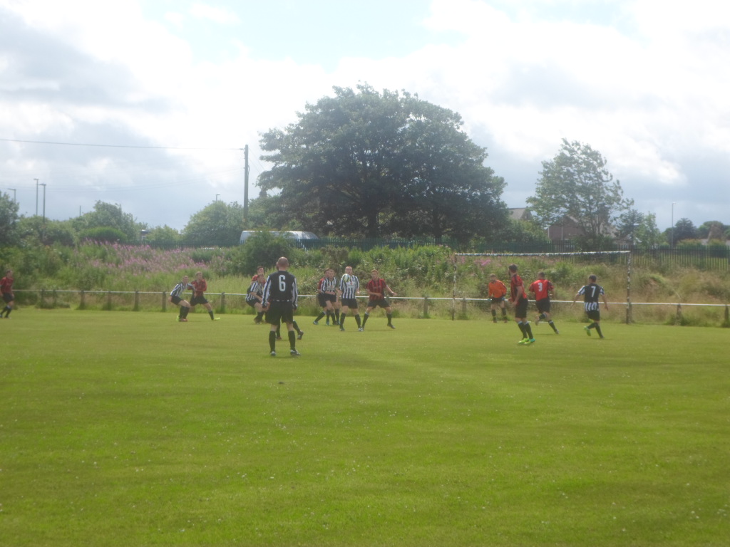 Whickham were up against Felling Magpies, who are part of the Leam Rangers set up, promoted into the Northern Alliance First Division for this season. The match was a good workout for both teams and a comfortable win for Whickham, who had the advantage of the slope and the wind factor in the first half. They took an early lead when a low Mark Pattison free kick(see bottom picture) went under the wall and the ‘keepers body, before Chad Collins doubled their lead on 38 minutes. Just before half time Pattison capitalised on a clumsy error by the goalie to make it 3-0 at the break. I watched the match with Squad #121 Paul Johnson, who had traveled up via several buses from Stockton for just another ground tick. We saw Felling improved in the second half but fall further behind late on when Pattison completed his hat-trick with a fine finish on 74 minutes, to round off an easy 4-0 victory for Whickham.
