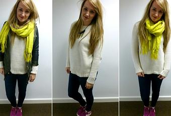 Jumper: MangoJeans: TopshopTrainers: Nike Jacket: PrimarkScarf: Madrid BoutiqueNecklace: DebenhamsI picked this jumper up in London last week and although a little unsure of it at first, I seem to be turning to it all the time now its turned chilly. It was only £35 which I think is quite reasonable for a chunky knit! Really loving Mango at the moment, in fact loving Autumnal fashion in general - want it all!Getting my hair cut and coloured tomorrow, thank goodness, it's such a mess! Would love to go back to my natural light brown color and dip dye the ends, but one - I'm afraid of too much change, and two - I have so many gray hairs (no joke) which are easier to hide with highlights. So I'm planning on freshening up the blonde, adding some darker bits, and getting a couple of inches off the length. Sort me out please!