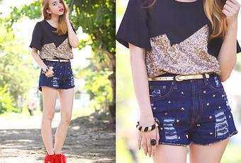 Sequined top and studded denim shorts, PINKaholic. Gold skinny belt, Forever 21. Red bandage wedges, DAS.
