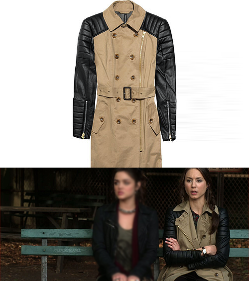 Spencer Hastings; Spunky, smart, wealthy, over-achiever. These are words which immediately come to mind whenever you see or hear Spencer. Her fashion sense reflects her personality to a T and in various ways, I admire her. Although at times her style can sometimes reflect that of someone older than her 18 year old self, she always wears outfits which are classic and different. This trench by W118 by Walter Baker Milly combines both elements of Spencer's personality; black faux leather sleeves to represent her spunky attitude, and the classic belted body to show her classy and mature side. Why, oh why must this trench be sold out online? (sad face)