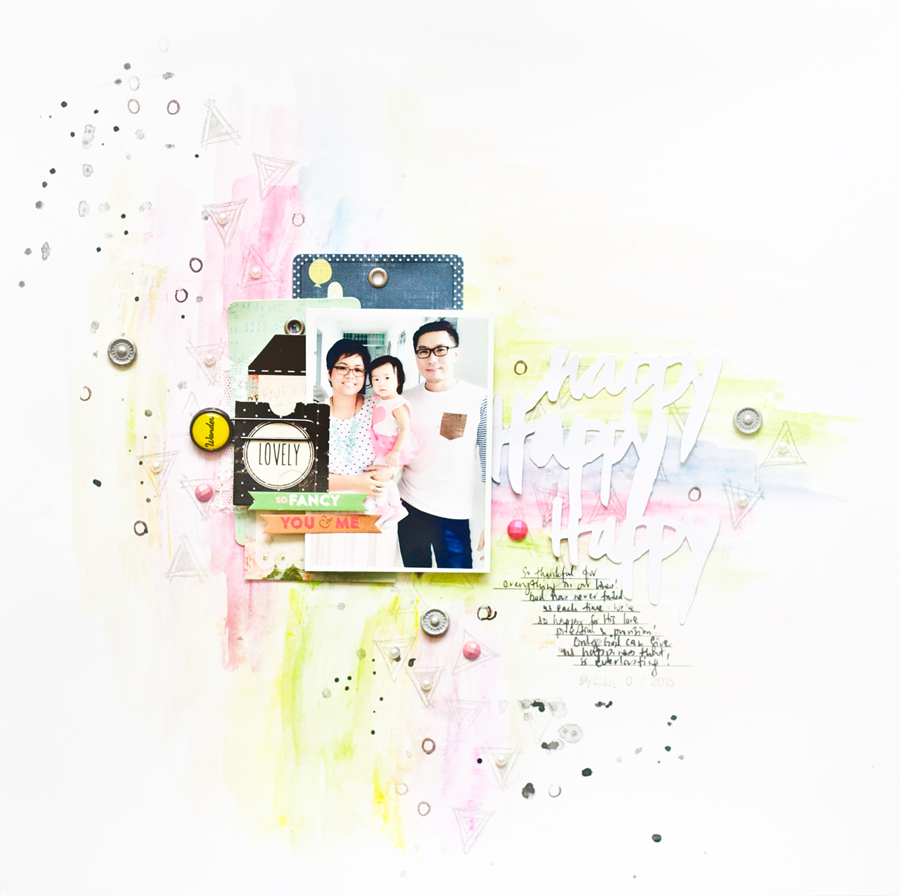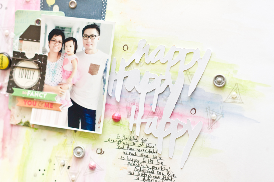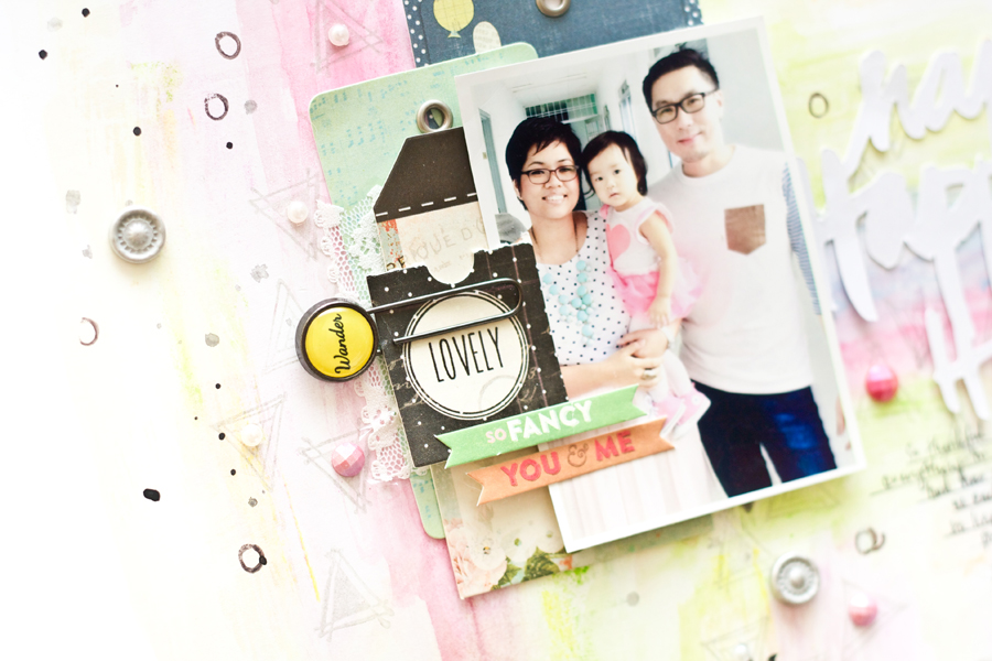 The colours are inspired by the photo, on the attires we were wearing. I always love to pick colours on what we're wearing or the colours in the photo. That way it will create a cohesive look throughout your layout/project. Once the background is dried, I did some stamping and splattered the rest of the cardstock with black mist. I really had a blast, can you tell? :PTip >> Whenever I use oil pastels or paint, I will prime my cardstock with gesso first. It will help bring out the actual color of the oil pastels, while giving the whole page a vibrant look too.____________________________________Close-up shots: