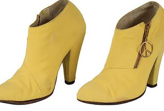 Do you remember Prince's infamous yellow high-heeled boots from the Sign o' the Times tour, the ones with the peace symbol zipper pulls? Well, they're currently up for auction and slated to bring in over $12,000. The current bid is at $12,974. Brought to you by RR Auction, the first-ever Prince themed auction includes items personally-owned and worn by the musical icon. The exceptional offerings cover scarce handwritten lyrics, attractive gold and platinum sales awards, rare albums, and stage-worn jewelry and accessories, and of course the famed boots.