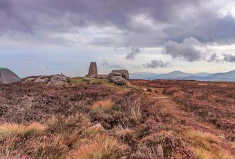 Retrace steps from Raven’s Rock back to the main path then shortly after veer left up a slope on a narrower path. This leads northwest to the summit of Prince William’s Seat, which is marked by a trig pillar amongst a jumble of rocks. Here, the barren Wicklow landscape away to the south contrasts quite profoundly from the gray metropolis of Dublin and its rolling hills in the opposite direction. On a clear day you should be able to see all the popular hills ranging from Kippure to Fairy Castle and the Great Sugar Loaf.