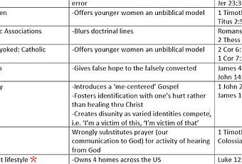 Beth Moore has been on a downward trajectory since the beginning of her ministry. Her issues are not new. I thought if I put some of the issues in list form, it might make things plainer. This list doesn't even contain problems about her legalism, pop psychology, or her atrocious behavior on Twitter toward those who raise objections to her teaching. It doesn't mention unethical publication practices such as deleting half a chapter from her Kindle version and leaving it in the hard copy without letting readers know there was a substantial difference in content they were paying for. One can only fit so much into one table.