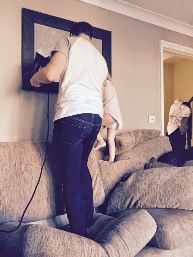 Wednesday - Liam was going out with his mates, he always does his hair in the living room mirror. Summer got up in front of the mirror, so he had to do her hair for her as well.