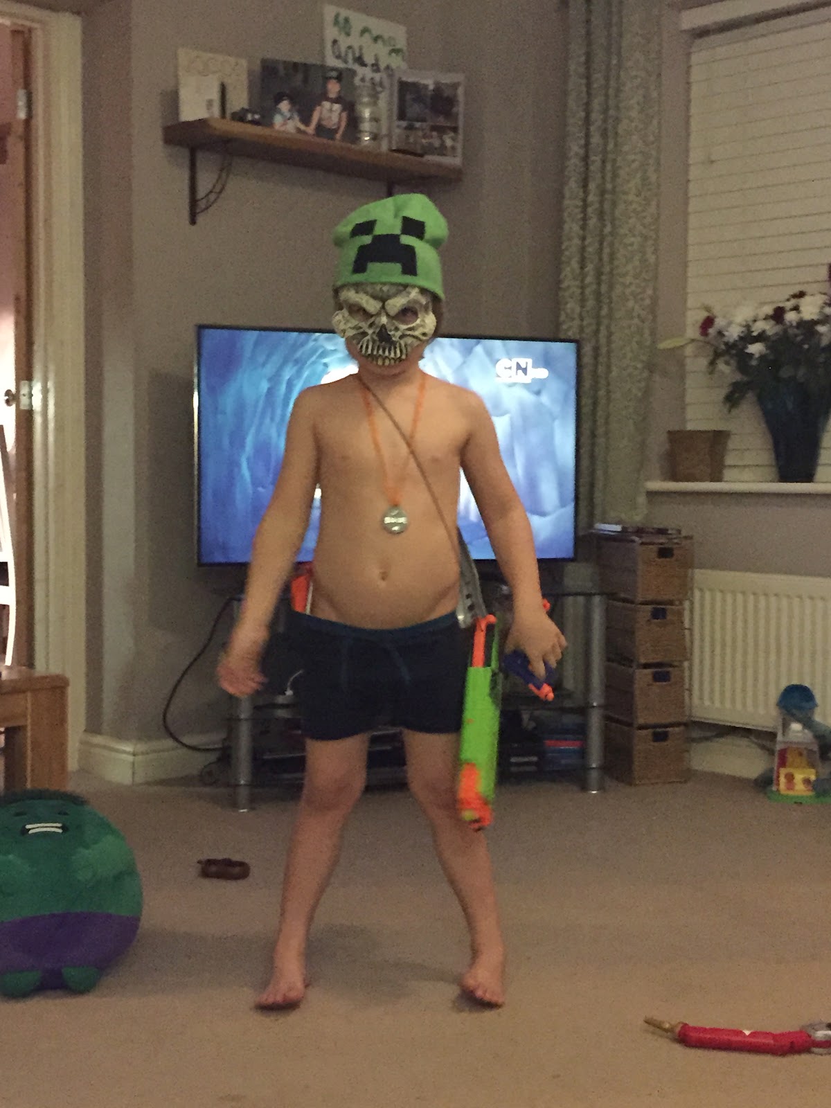 Thursday - Summer was poorly and had the sick bug, so Jacob kept himself amused by dressing up and playing with his Nerf guns.
