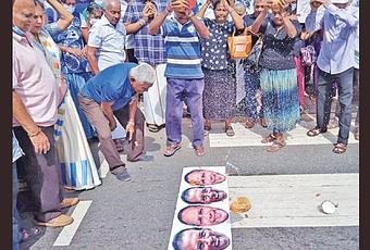 A group of SLFP members and Nawa Lanka Nidahas Peramuna members protested against the removal of former President Chandrika Bandaranaike Kumaratunga from the Sri Lanka Freedom Party on Saturday. They started a march from Nittambuwa Sanghabodhi Vidyalaya grounds and marched to the Horagolla Samadhi Statue and dashed coconuts on the Colombo – Kandy road on pictures of current SLFP leaders.Veyangoda Special Corr.