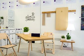 The Tilt lightweight, folding chair from Folditure mingles with a table made from Studio Gorm's flexible Peg Furniture System, above which hangs the Pétale sound-absorbing lamp from Luceplan.