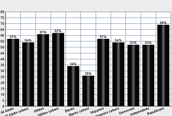 I have a couple of other points to make. First, that 57% support of all adults (54% among urban adults) should be much higher if police misconduct was not happening far too often. It should scare the hell out of police departments in this country that at least 43% of all Americans don't have a lot of confidence in them -- and it should spur them to stop making excuses for the misconduct, and make a better effort to get rid of the bad officers instead of trying to protect them.