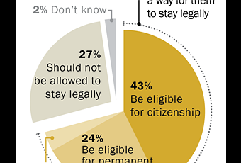 The following charts are from the recent survey on immigration reform by the Pew Research Center (taken between March 13th and 17th of 1,501 nationwide adults -- with a margin of error of 2.9 points). Note that 71% of the public wants a way for the undocumented immigrants to stay in this country legally, while only 27% say they should not be allowed to stay. And this majority who want a legal way for them to stay cuts across all demographic lines (including a significant majority of Republicans). The percentage wanting a path to citizenship is smaller (43%), but is still larger than those wanting only permanent residency (24%). Here are some of the charts from the Pew survey: