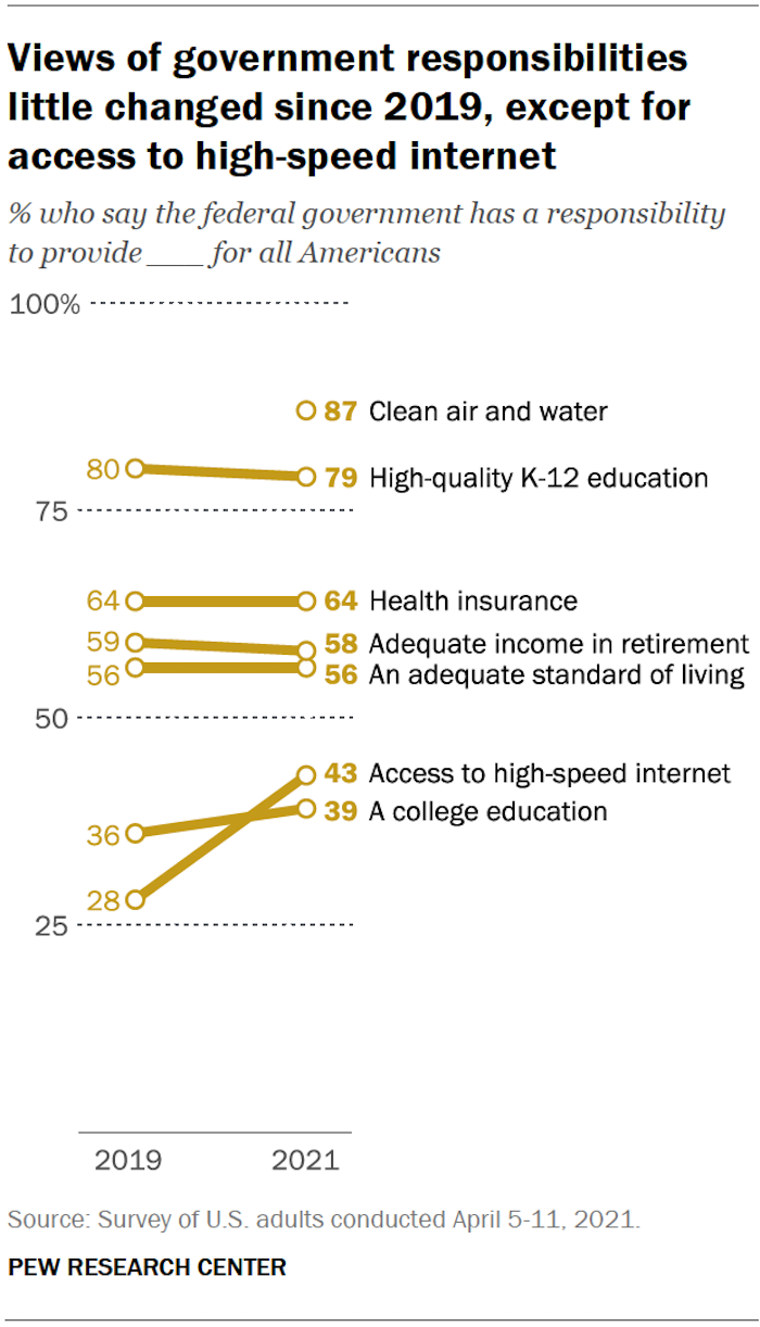 These charts are from the Pew Research Center. It shows there are several areas in which a majority of the public believes government has a responsibility. The results are from a survey they did between April 5th and 11th of a national sample of 5,109 adults, with a 2.1 point margin of error.