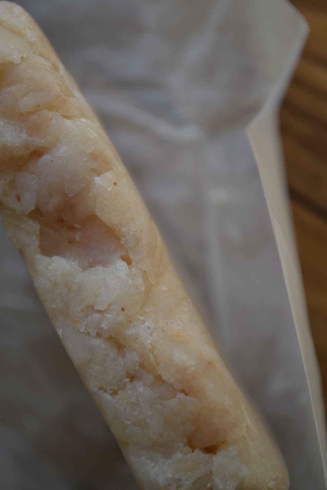 The most obvious thing after unwrapping is the absolutely delicious scent. It makes your mouth water. It has a very warm, vanilla and banana smell, definitely like something you'd eat. The soap is 100% natural and contains no nasty additives. The ingredients include Olive, Oil, Shea butter and Coconut Oil, all of which are extremely nourishing and soothing for dry or sensitive skin.
